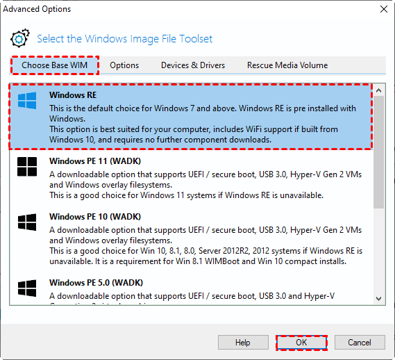 3. In the Advanced Options window, go to the Choose Base WIM tab, choose Windows RE and click OK.