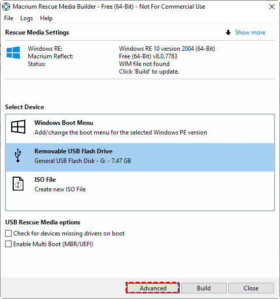 2. If the program detects there is a USB drive inserted, it will select the Removable USB Flash Drive option automatically. Click Advanced in the bottom.