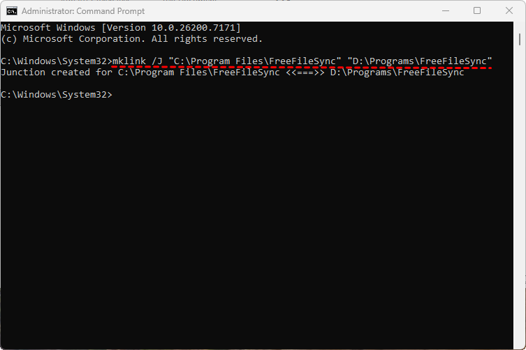 mklink /J "C:\Program Files\FreeFileSync" "D:\Programs\FreeFileSync"