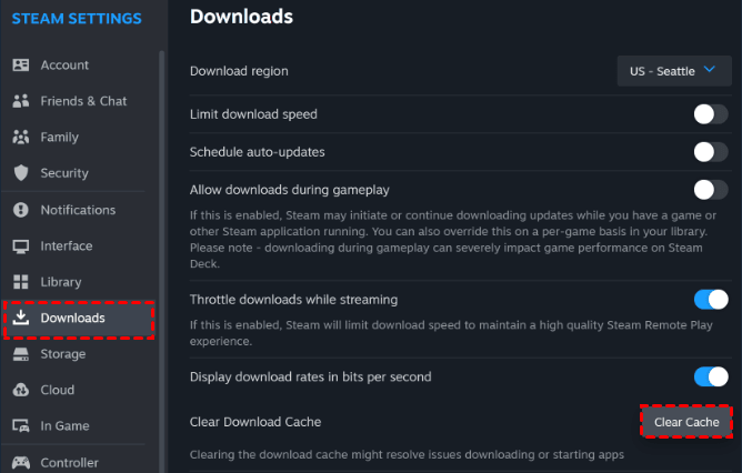 2. Select the Downloads section and you'll find the "Clear Download Cache" option at the bottom. Click Clear Cache.