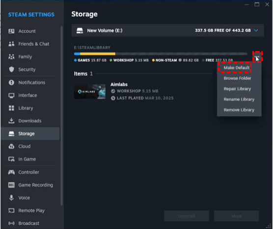 If you keep seeing the “not enough free disk space Steam” message even after freeing up storage, your current Steam Library folder might simply be full. Moving your game installs to a different drive can fix this instantly.