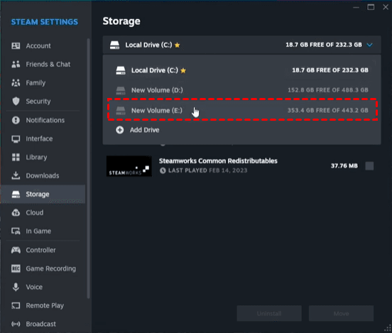 Note: If you want to store your Steam files to an external drive, click Add Drive to add it.