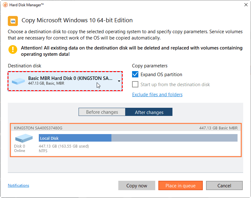 Step 6. Check the resulting disk layouts at “After changes” and click Copy now to start the operation immediately.