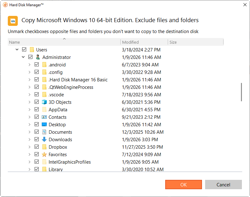 - If the selected disk is not enough in capacity to hold your OS, you can click Exclude files and folders to remove redundant data from the migration process.