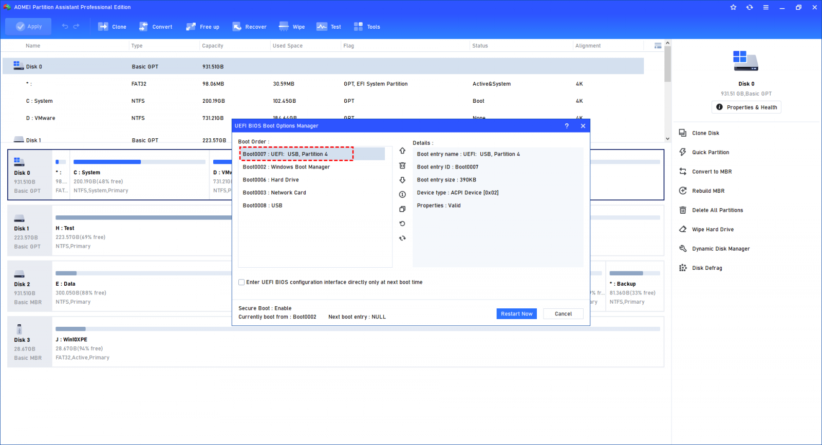 If you can boot into Windows of the computer, with UEFI BIOS Boot Options Manager in AOMEI Partition Assistant, you can easily and quickly change EFI/UEFI BIOS Boot Options without manual entry into BIOS and complicated modification of startup entries.