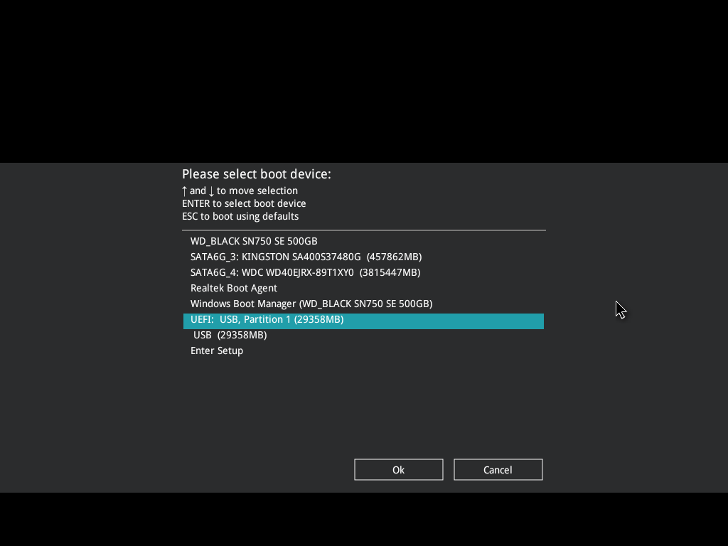 2. Use the arrow keys on your keyboard, select the USB drive and press Enter. The computer will immediately restart and boot from the USB drive.