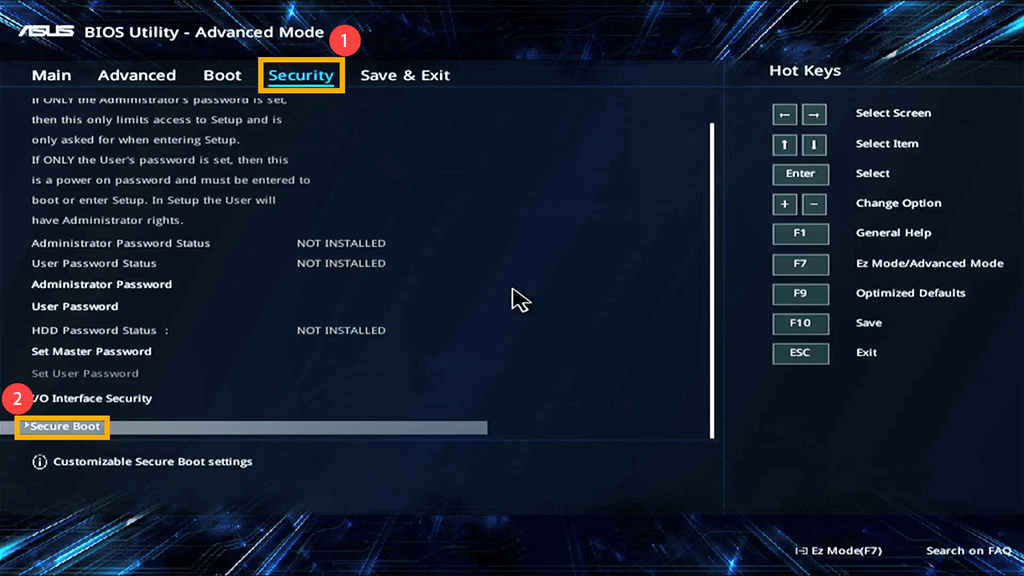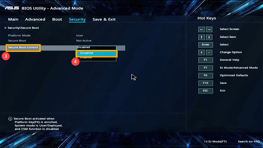 To disable Secure Boot, go to [Security] screen, then select [Secure Boot].