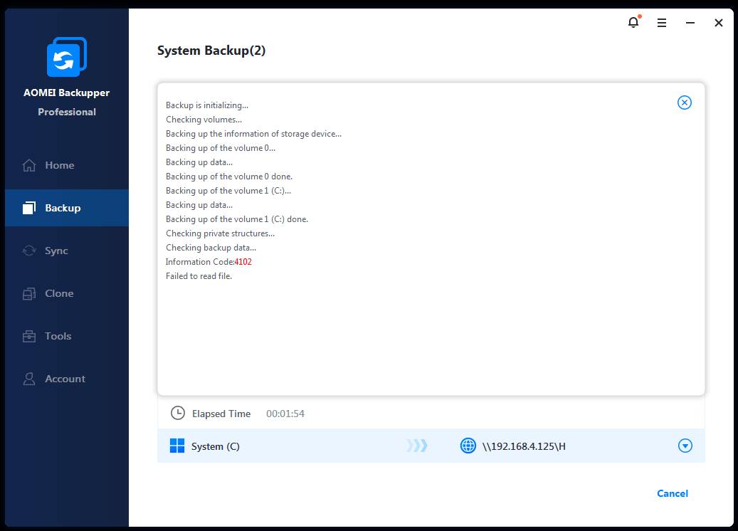 In a few cases, when you check a backup image or do an incremental backup/differential backup, you may encounter Error Code 4102: Failed to read file. This error does not mean the image file is invalid, but AOMEI Backupper has failed to read the image file at that specific time.
