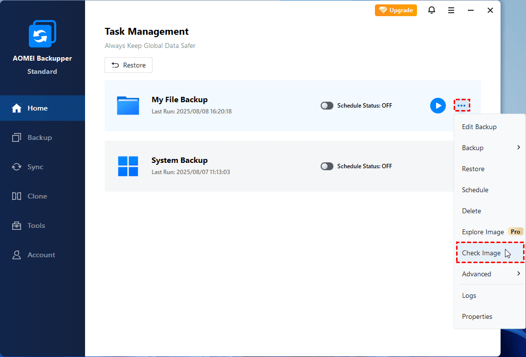 1. If you get this error when performing a backup with the “Check backup integrity on completion” option checked, you can separately check the image file after the backup is done. Under the "Home" tab, find the task -> click three dots -> Check Image.