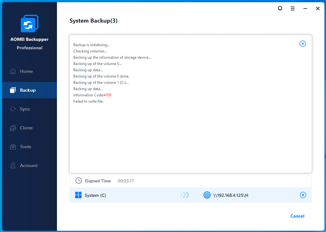 In a few cases, when you choose to do a backup of any kind, you may encounter Error Code 4103: Failed to write file.
