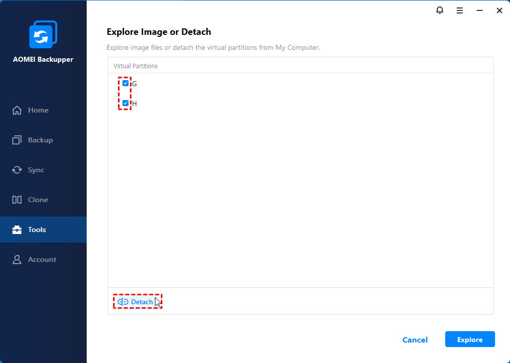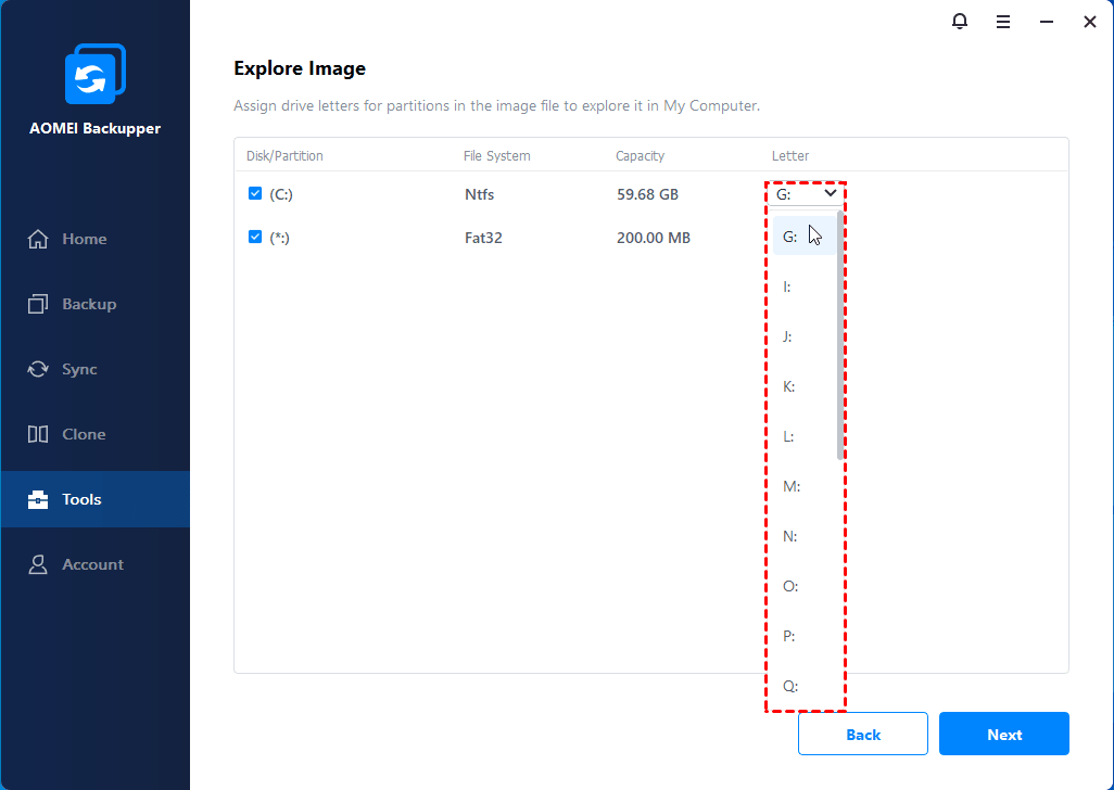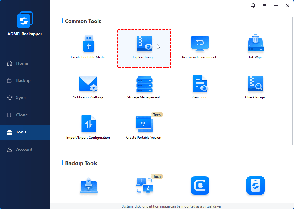 In some cases, you may just would like to get some files from the backup image with no need to restore the whole image. Or for insurance reasons, you want to check the files in the backup images. You can use Explore Image in Backupper to mount the image as a virtual drive.