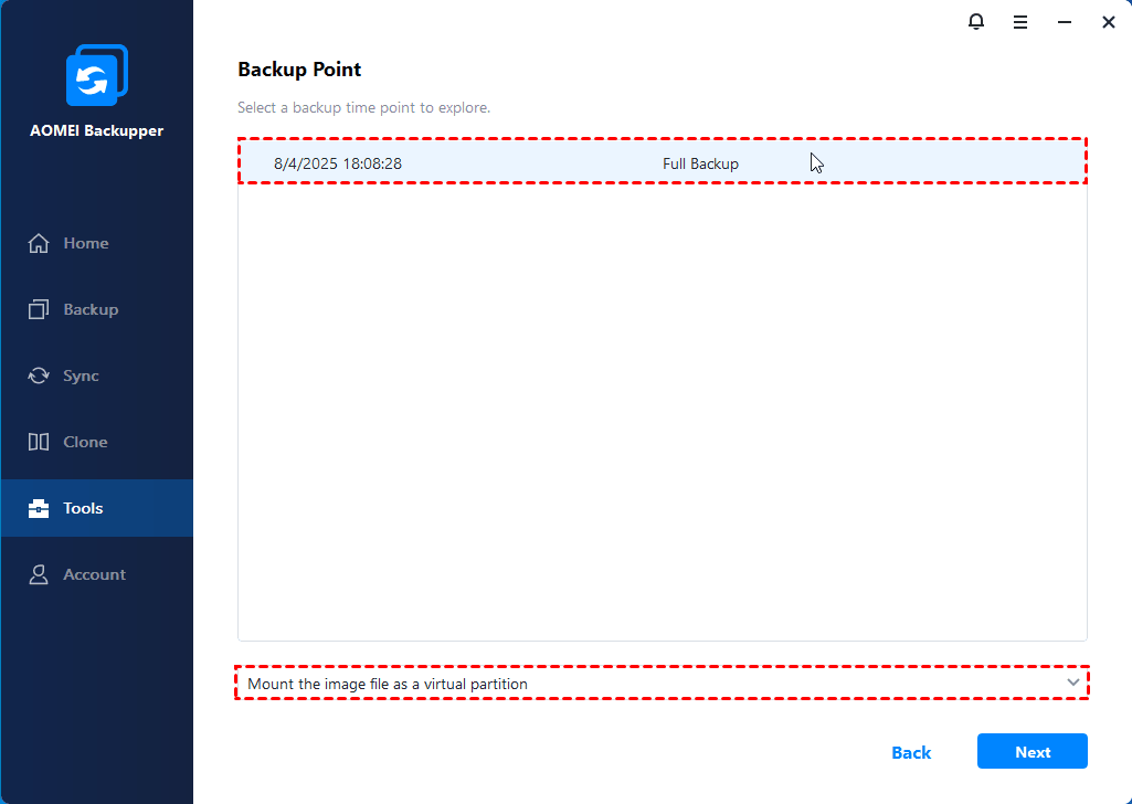 3. Select a backup point to explore the image and choose Mount the image file as a virtual partition. Click Next.