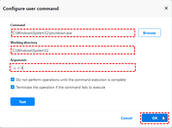 For example, you can add the command “shutdown.exe” and configure “-s -t 0” in Arguments. Please check the configuration in the following screenshot.