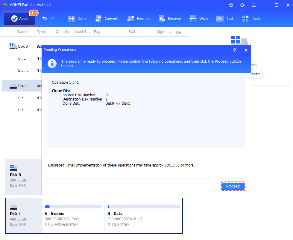 Step 5. At last, click "Apply" and "Proceed" in the main interface to start cloning the hard drive.