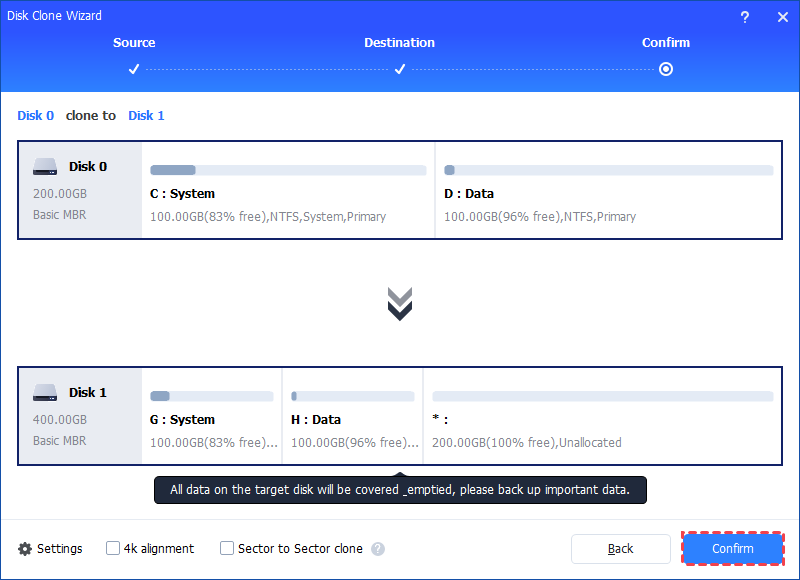Step 4. Then, you can check the source and destination disk in the next window or change to “Sector to Sector clone” if your drive has bad sectors, and click the "Confirm" button to continue if there is no problem.