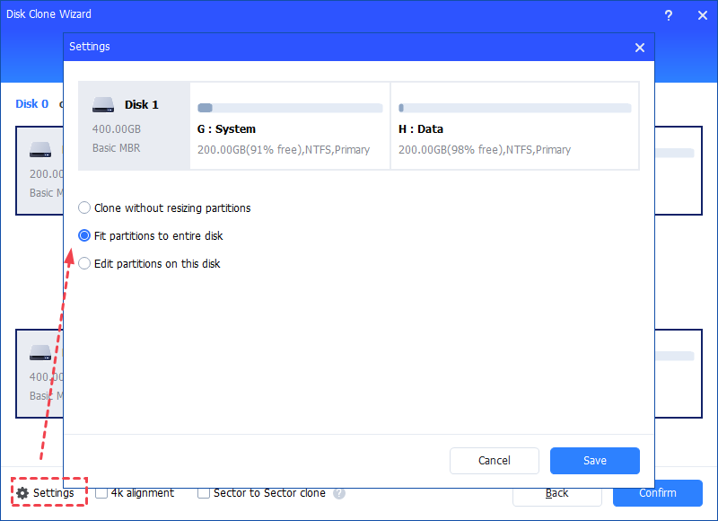 Here, you can also click the "Settings" button to adjust the partition size on the destination disk or tick "4k alignment" to improve the reading and writing speed of SSD if the target disk is an SSD drive.
