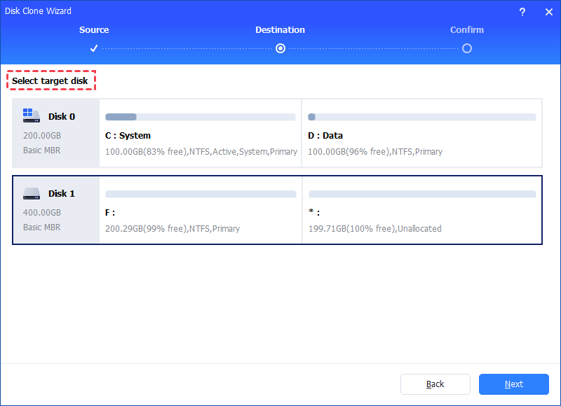 Step 3. Select the destination disk to store the data on the source disk, and then click "Next".