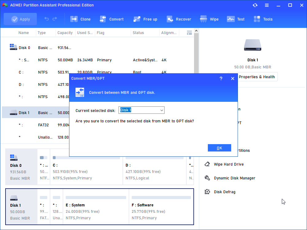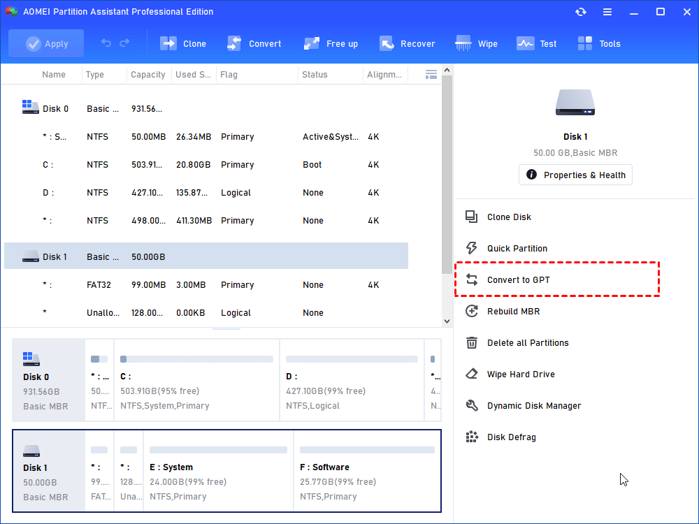 Fix 1. Convert MBR to GPT with AOMEI Partition Assistant