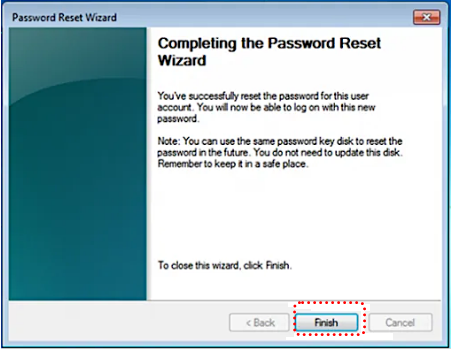 Step 4. Click Finish to close the wizard. You can now log into your Windows 7 account immediately using your new credentials.