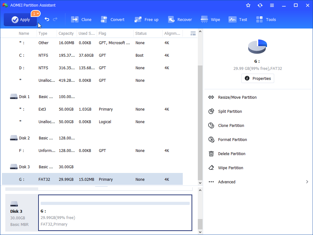 Step 3. Return to the main interface, and you’ll notice your SD card is now formatted to FAT32. Click Apply, and the process will begin immediately.