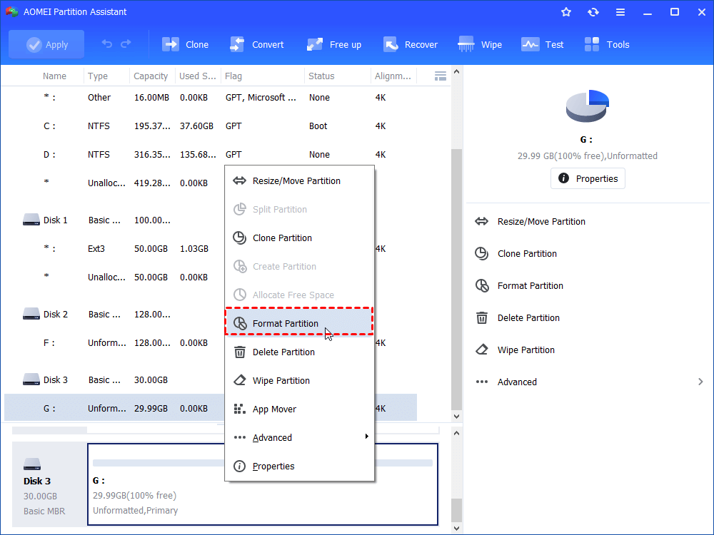 Step 1. Install and launch AOMEI Partition Software. Once opened, all your disks and partitions will be displayed on the main screen. Right-click the SD card and select Format Partition.