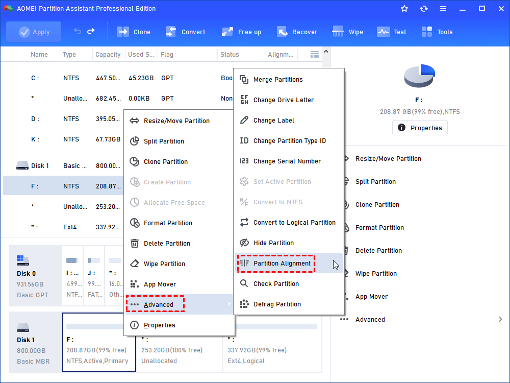 Unlike traditional hard drives, SSDs generally do not require defragmentation. Their distinct operating mechanisms mean that defragging an SSD can actually cause unnecessary wear, potentially shortening its lifespan. Instead, to optimize SSD performance, AOMEI Partition Software also offers a feature called SSD 4K Alignment, which improves read/write efficiency without harming the drive.