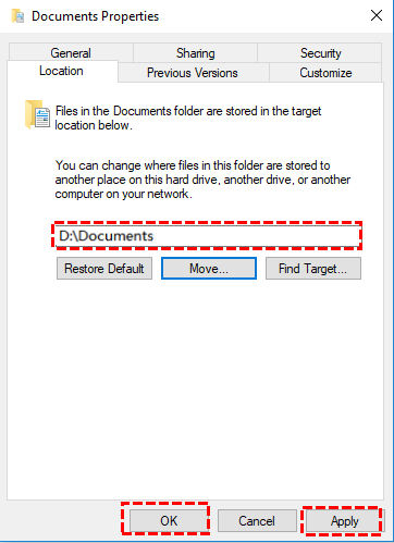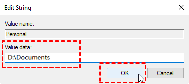 Step 5. In the Value data field, enter the new folder location (for example, D:\Documents) and click OK. Make sure the destination folder exists beforehand.