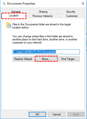 Step 3. In the Properties window, go to the Location tab and click Move.