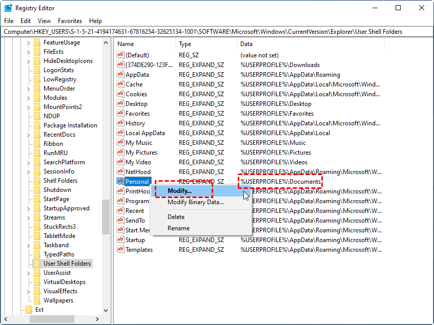 Step 4. Locate the string or data entry for %USERPROFILE%\Documents, right-click it, and select Modify.