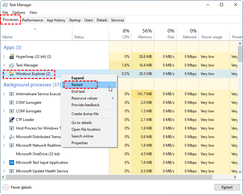 Step 7. Under the Processes tab, locate Windows Explorer, right-click it, and select Restart to apply the changes.