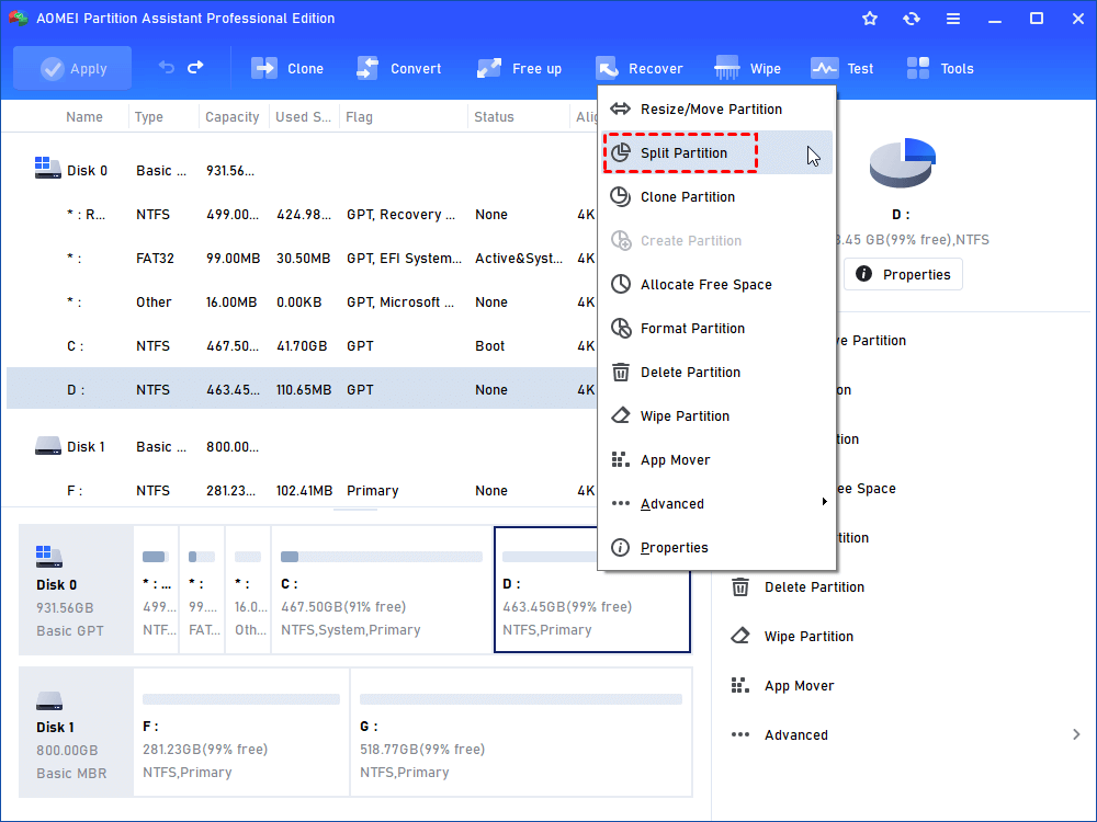 Step 1. Install and launch AOMEI Partition Software. Then, right-click on the D drive and select "Split Partition".