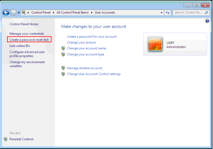 Step 1.Insert the USB drive into your computer and open the Control Panel. Then locate and click on "User Accounts", select "Create a password reset disk".