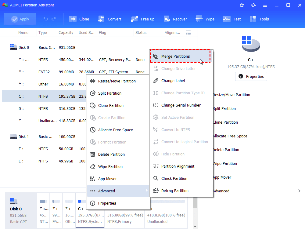 Step 1. Install and launch AOMEI Partition Software. Right-click the partition (here is C:) you want to merge, and click "Advanced" and then select the "Merge Partitions" feature in the drop-down menu.