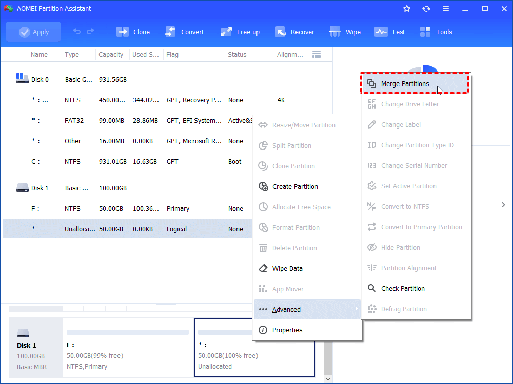 Step 1. Install and launch AOMEI Partition Software. In this example, there is an unallocated space behind F: partition. Right-click the partition (here is F:) where you want to merge unallocated space to and click "Advanced" and then select the "Merge Partitions" feature in the drop-down menu.