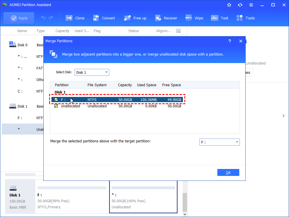 Step 2. In the pop-up window, tick the check boxes of which are in front of the partition and the unallocated space, and then click "OK" to continue. In this case, you cannot specify the target partition because F: is selected as the target partition in default and there is no other choice.