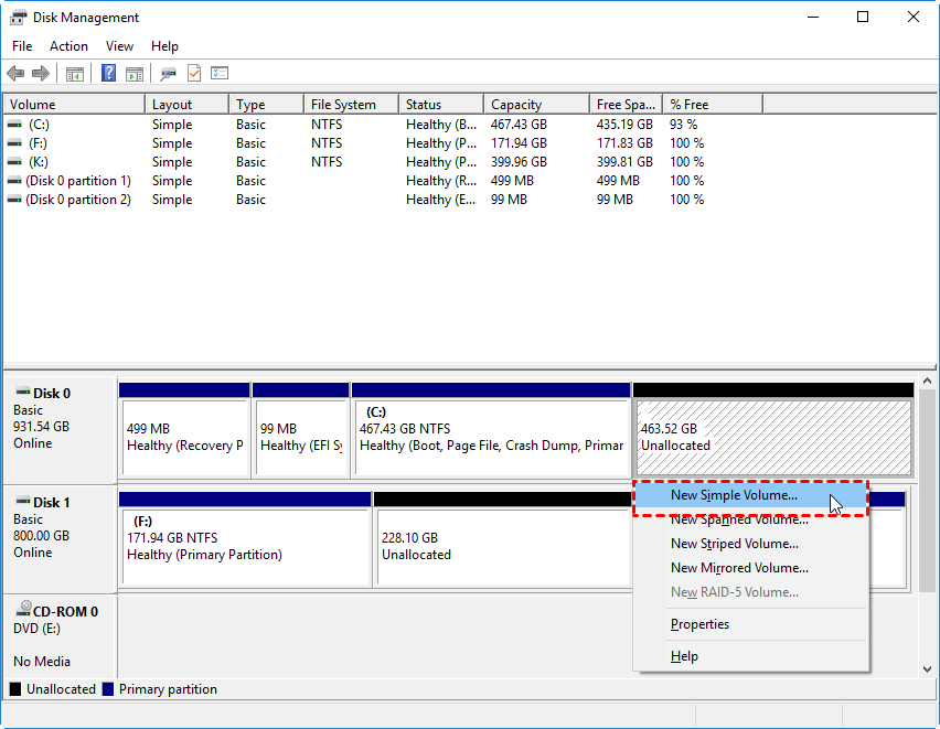 Step 3. Right-click the unallocated space and choose New Simple Volume.