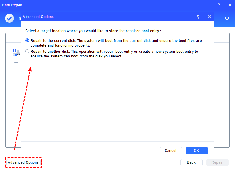 ♦ Repair to another disk: Repairs or creates a new boot entry on a selected disk, allowing the system to boot from that location.