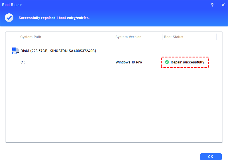 Step 4. Wait for the operation to complete. Once finished, review the results. A successful repair will display a “Repair Successfully” confirmation message.