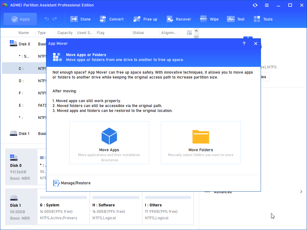 AOMEI Partition Software is a powerful disk management tool that allows you to perform a wide range of operations on your hard drives and partitions. One of its useful features is the ability to move apps, files and folders to another drive, which can help speed up your PC.