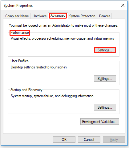 Step 3. In the System Properties window, switch to the Advanced tab. Under Performance, click Settings.
