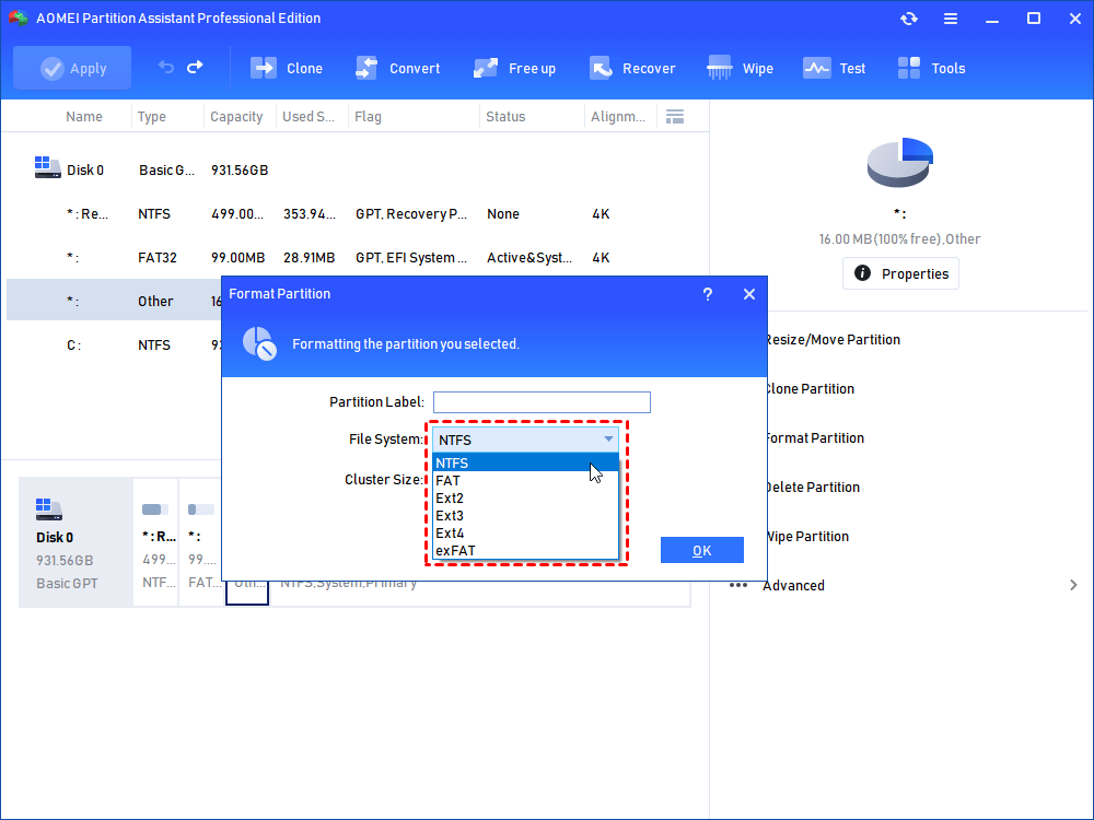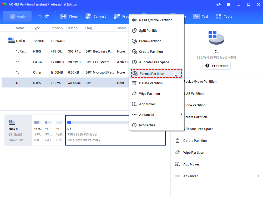 Here, let us take the “Format Partition” feature as an example to show you how powerful AOMEI Partition Software is in managing disks and partitions: