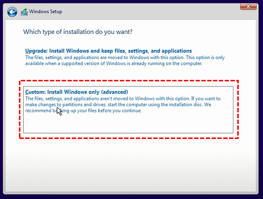 Step 7. Accept the License Term and click “Next”, and then choose “Custom: Install Windows only (advanced)” in the next window.