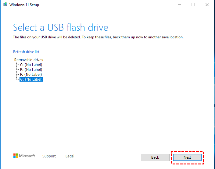 Step 3. In the "Windows 11 Setup" window, choose the "USB flash drive" option and select "Next".