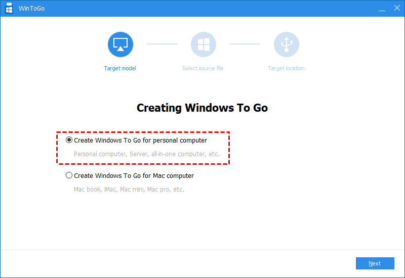 Step 3. Click “Create Windows To Go for personal computer” and choose “Next”.