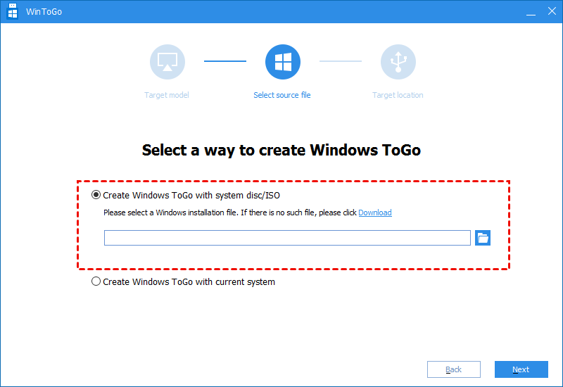 Step 4. Select “Create Windows To Go with system disc/ISO”. Usually, the Windows 11 ISO file will be detected automatically. If not, you can click the folder icon to select the target file manually. Then click “Next”.
