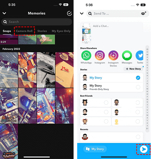 Step 4. Tap the arrow again to post it. The story is now saved to Memories, and your camera roll photo is backed up in Snapchat.
