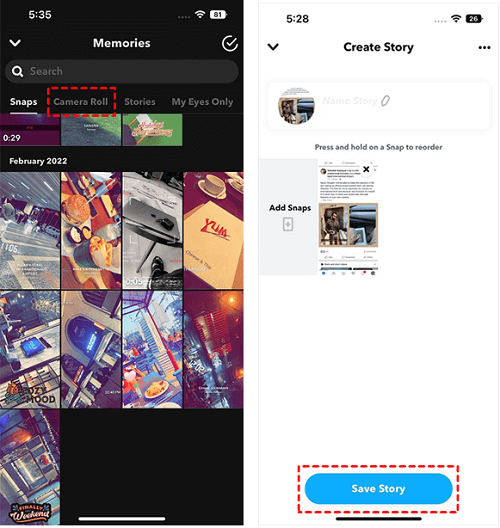 Step 4. After the story is created, tap Save Story. Your selected camera roll photos are now saved in the Memories section.
