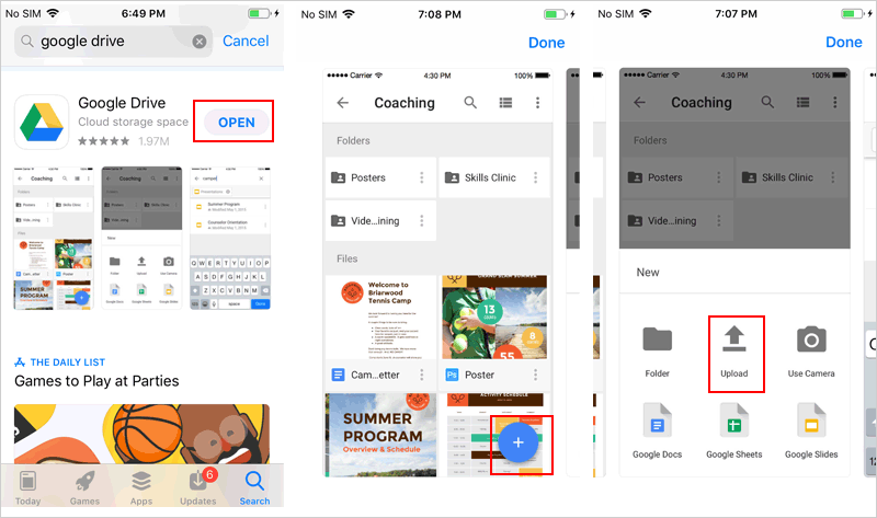 Step 2. Open the Google Drive app. Tap the "+" (Plus) icon in the bottom right corner. Select "Upload" from the menu.
