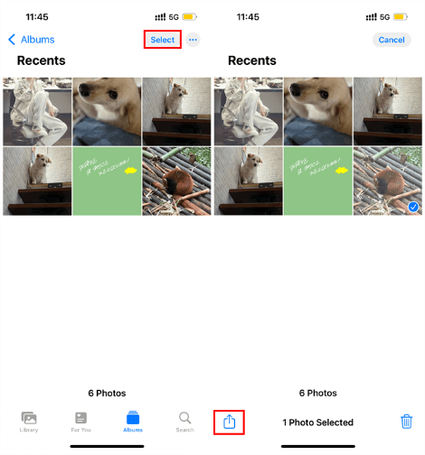 Step 1. Open the Photos app on your iPhone. Tap "Select" in the top right corner and choose the photo or photos you want to print.