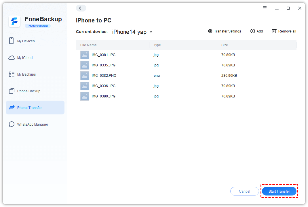 Step 3. Launch AOMEI FoneBackup. On the home screen, select "Phone Transfer" > Choose "iPhone to PC" mode > Click "Start Transfer."